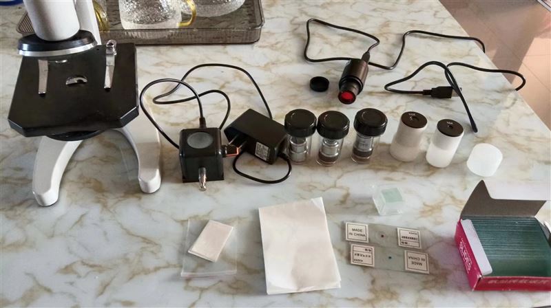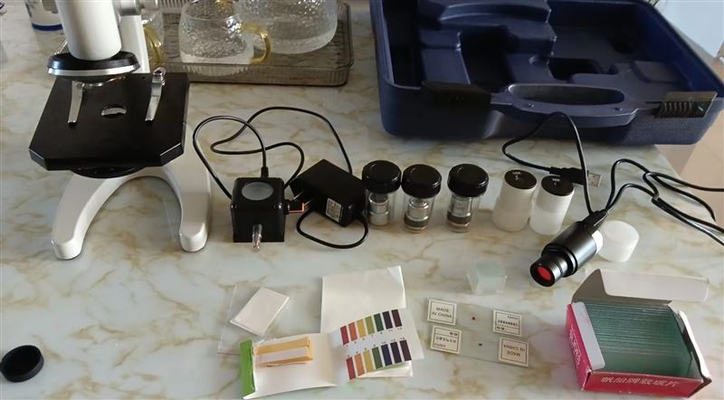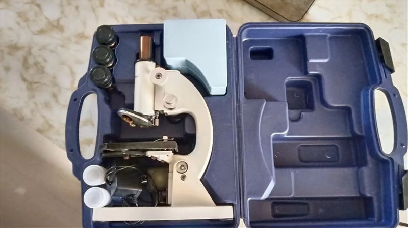 貝朗顯微鏡,640倍,帶電子顯微目鏡,電子反光鏡,配有載玻片蓋玻片吸水紙顯色卡,擦鏡紙,裝備箱,原價240,八九成新,鏡片無磨損