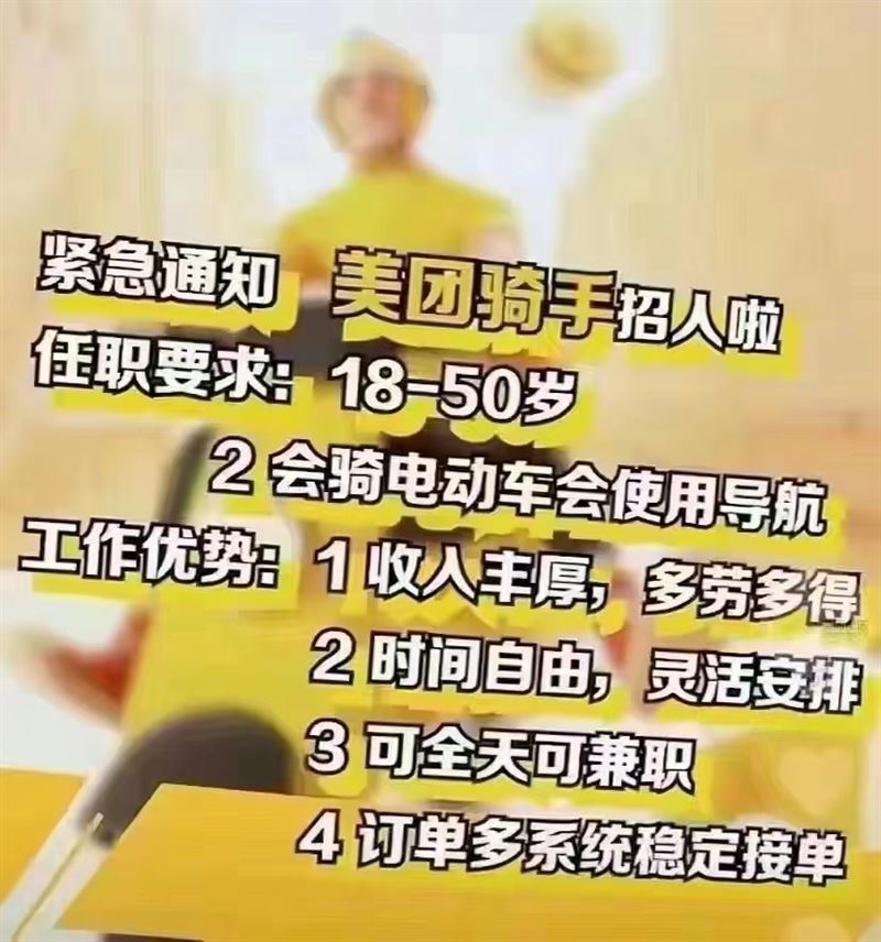 入職要求:18-55周歲會騎電動車會看導(dǎo)航?jīng)]有案底即可入職